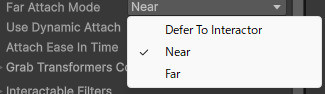 後は、遠くのものを持ったときに、遠いまま操作するか、手元に引き寄せるかを、XR Grab InteractableコンポーネントのFar Attach Modeから変更できます。
